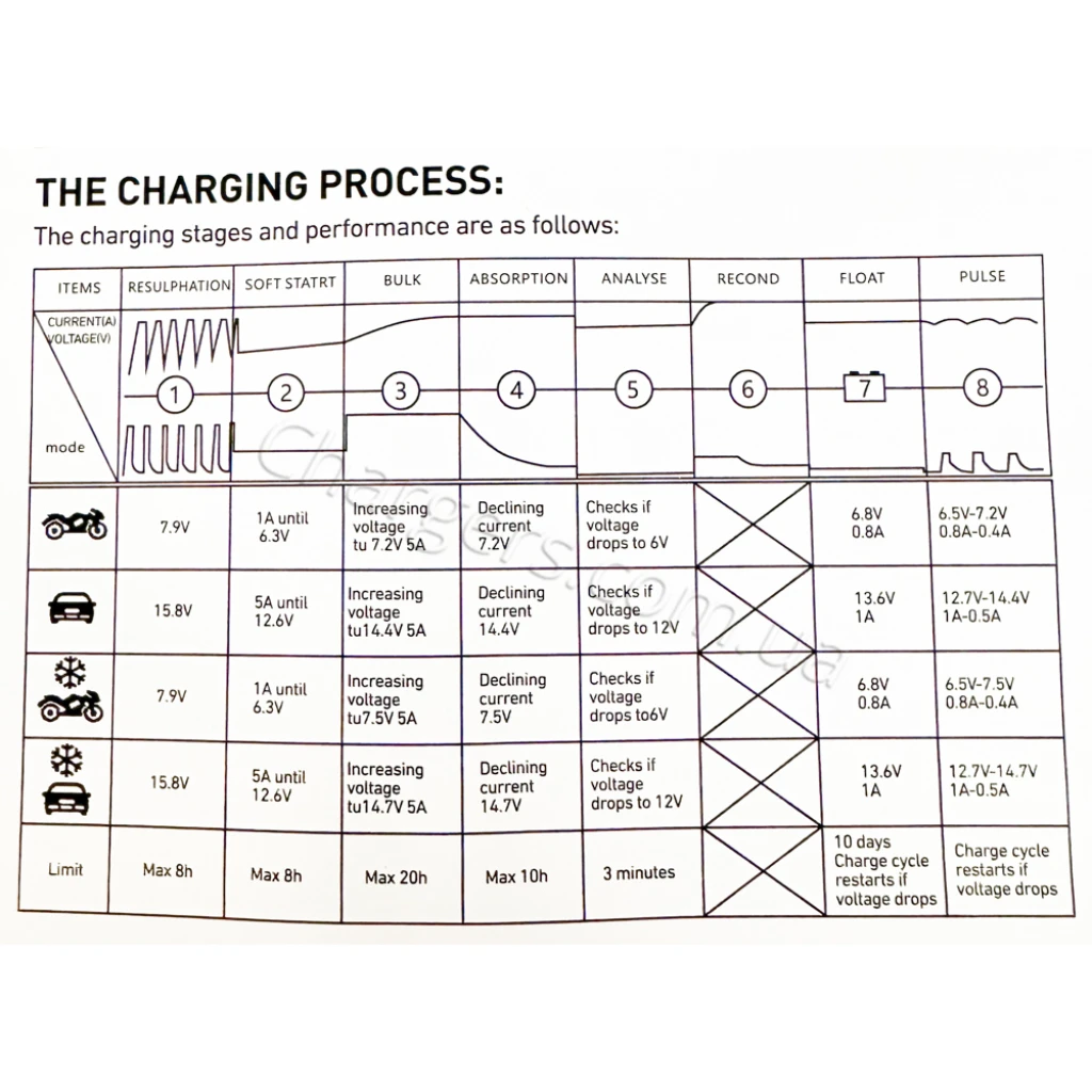 Сумісний із типами: MF, WET, Свинцево-кислотний, AGM, GEL. Діапазон/режими струму: 1A, 5A.