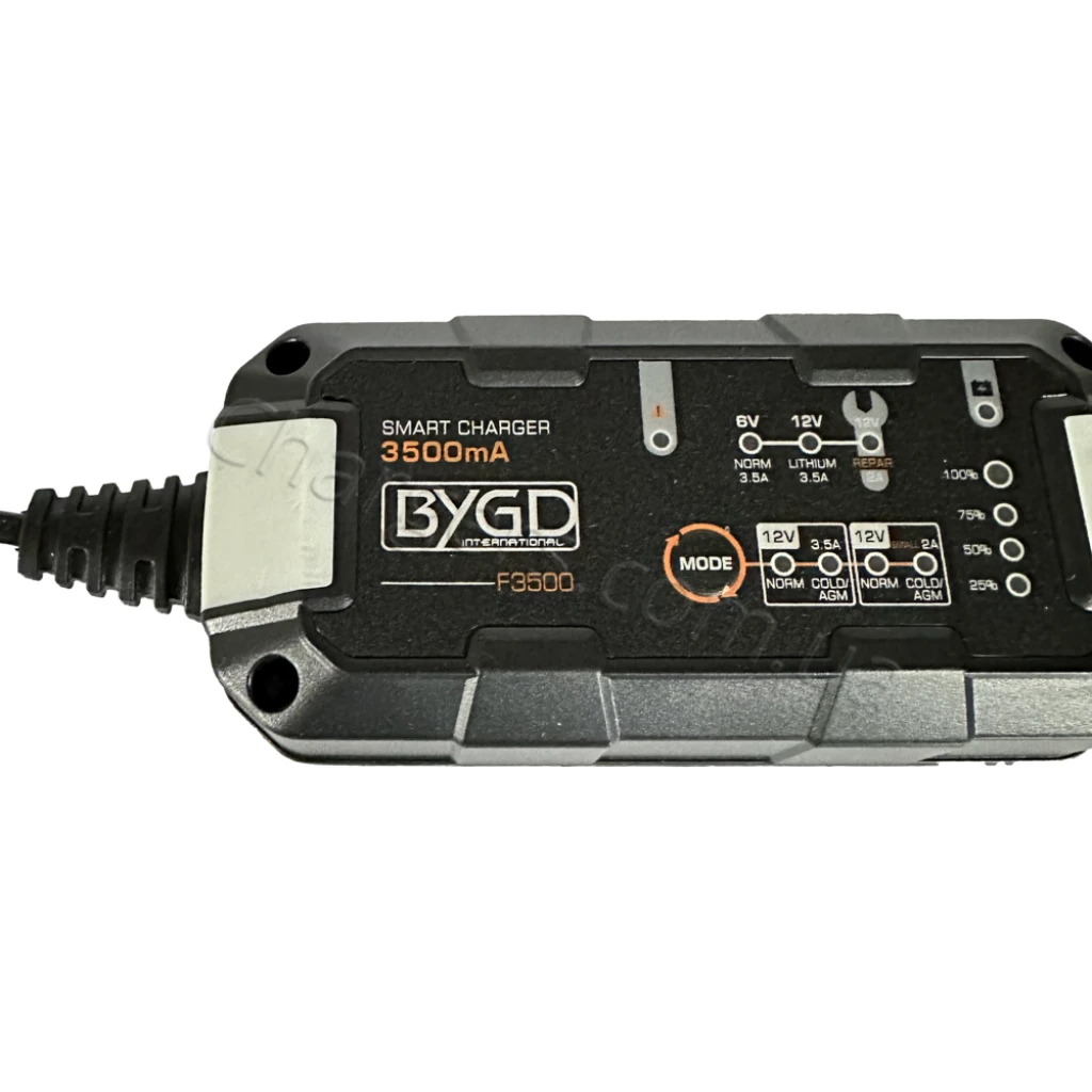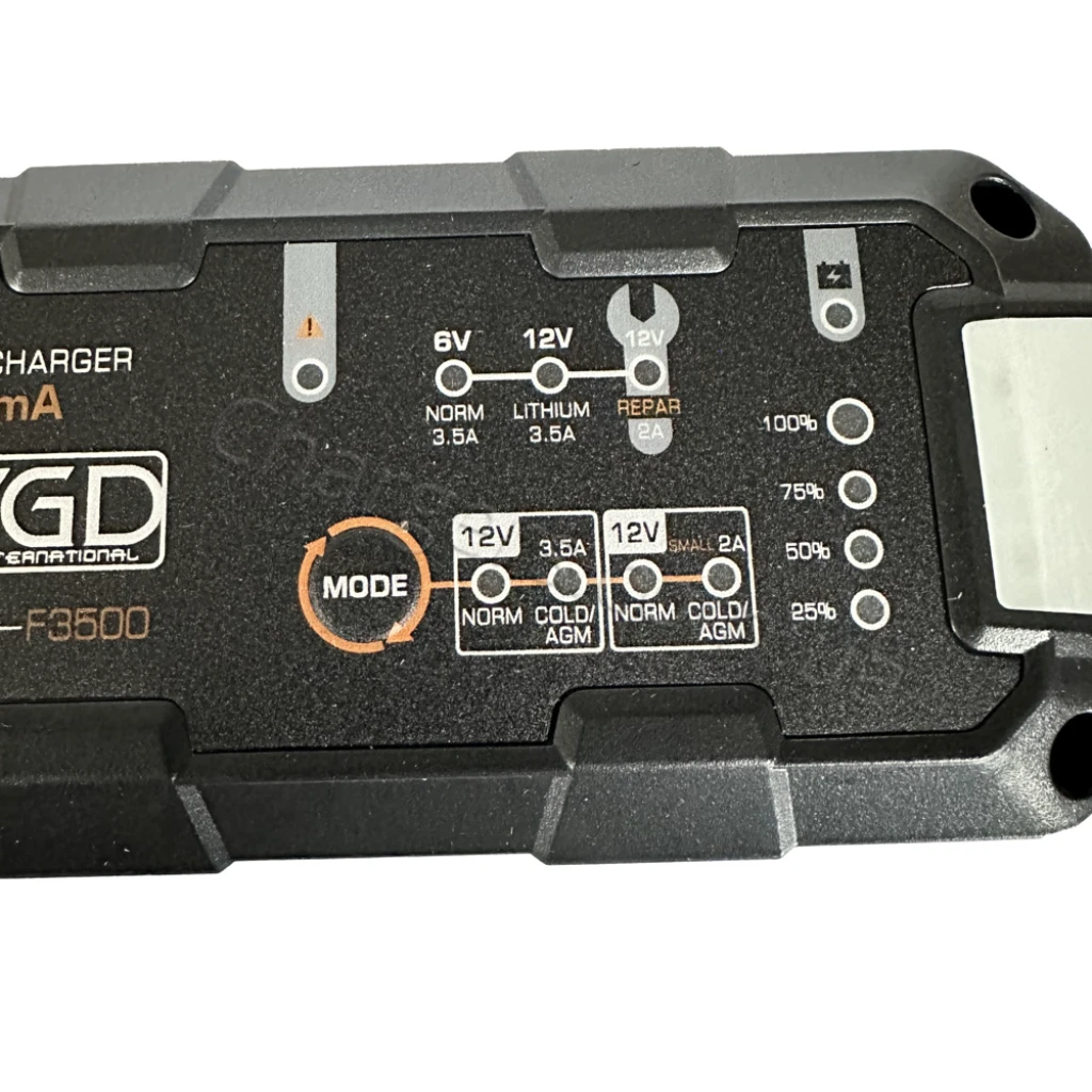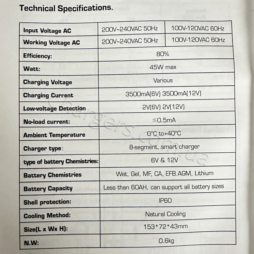 Совместим с типами: Lithium, MF, VRLA, WET, Свинцово-кислотный, EFB, AGM, GEL. Напряжение зарядки: 6V, 12V. Диапазон/режимы тока: 3.5A.